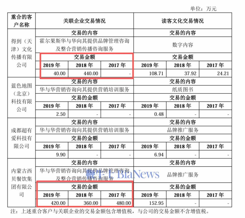 在读客文化申请上市时的一份文件中,《BUG》栏目查询到,西贝和华与华在2017年—2019年的交易费用分别为480万元、360万元和420万元。该文件也刊载了得到与华与华的交易费用,2018年为440万元,2019年为40万元。