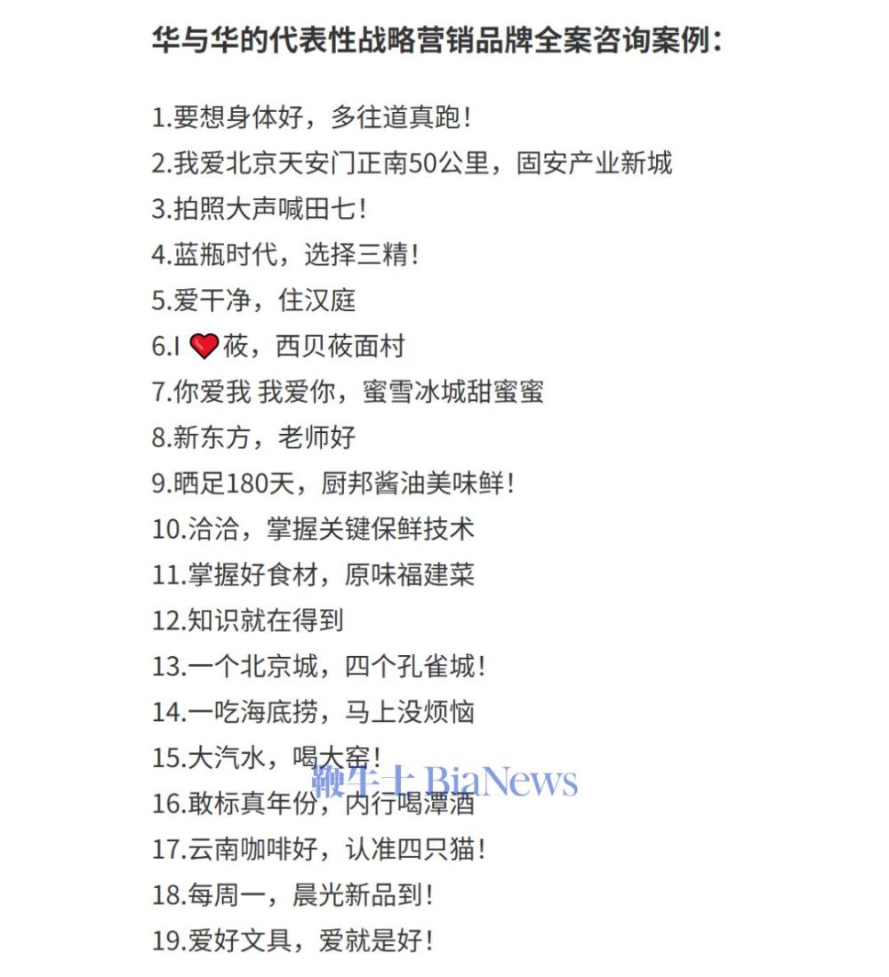 华与华在官网中还指出,其服务方式有且仅有一种,即为客户提供全年全案的营销咨询服务,从不提供单个项目的服务模式。此外,华与华不参与投标和比稿,也不设专门团队发展新客户,希望客户在充分了解华与华的前提下进行合作。