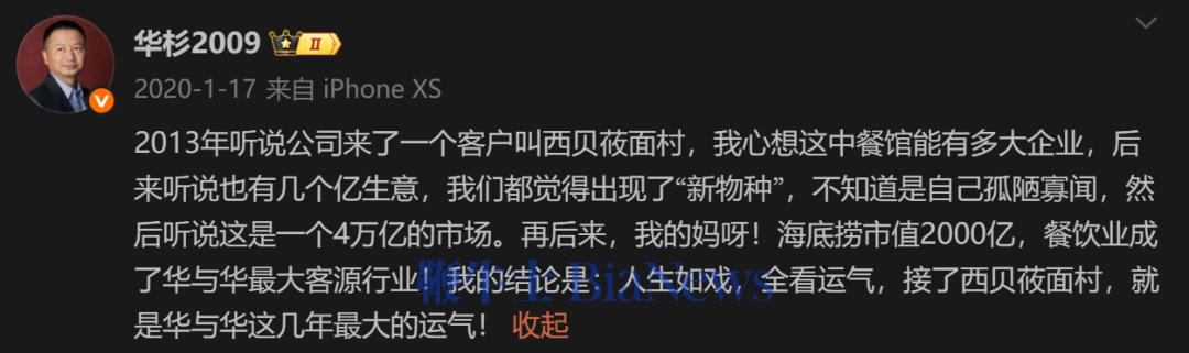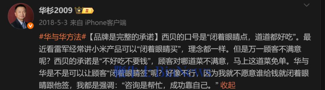 与西贝合作后,华杉也频繁发文提及西贝。他曾表示,“华与华之前从来没有接触过餐饮业,因为做了西贝,就成了餐饮业最大的咨询公司。”他还称,“接了西贝莜面村,就是华与华这几年最大的运气!”